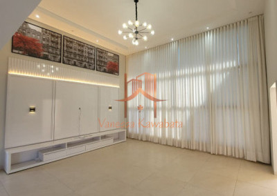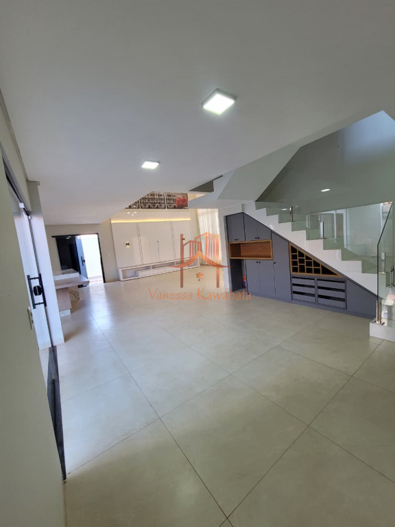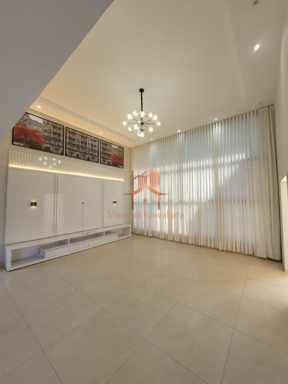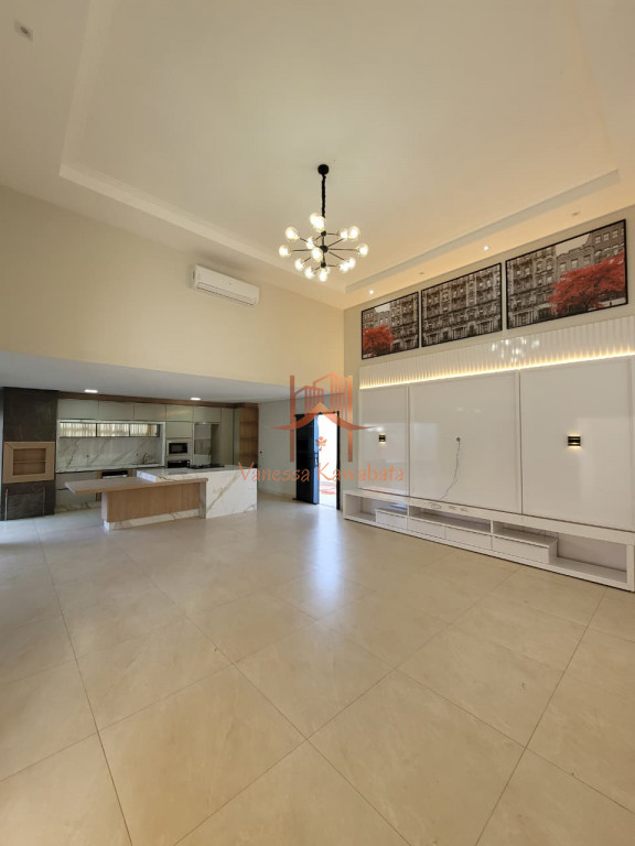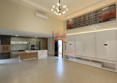 Sala integrada com pé-direito duplo e ar-condicionado